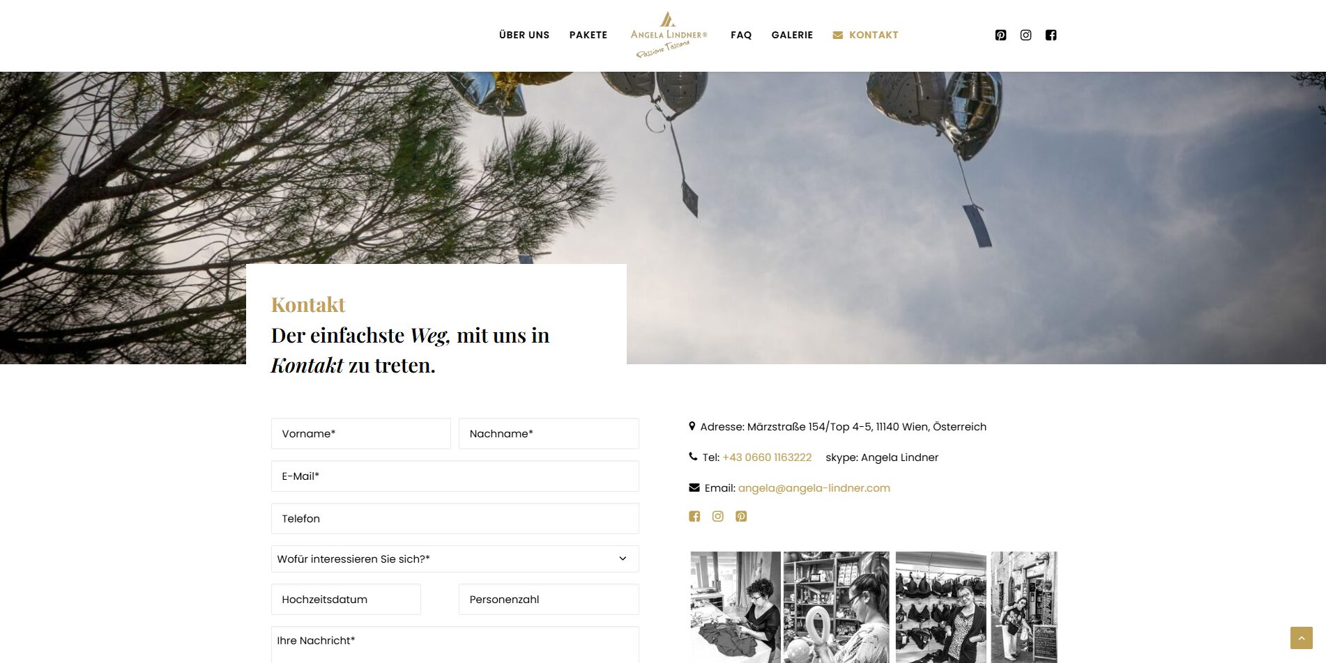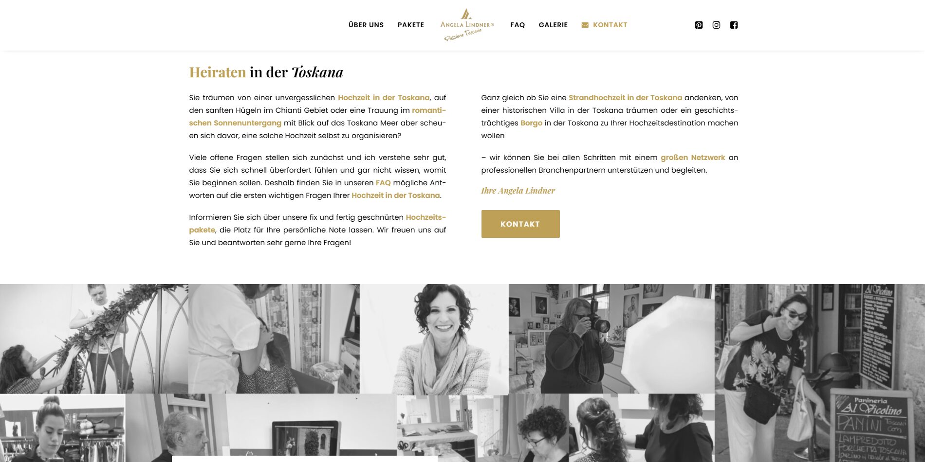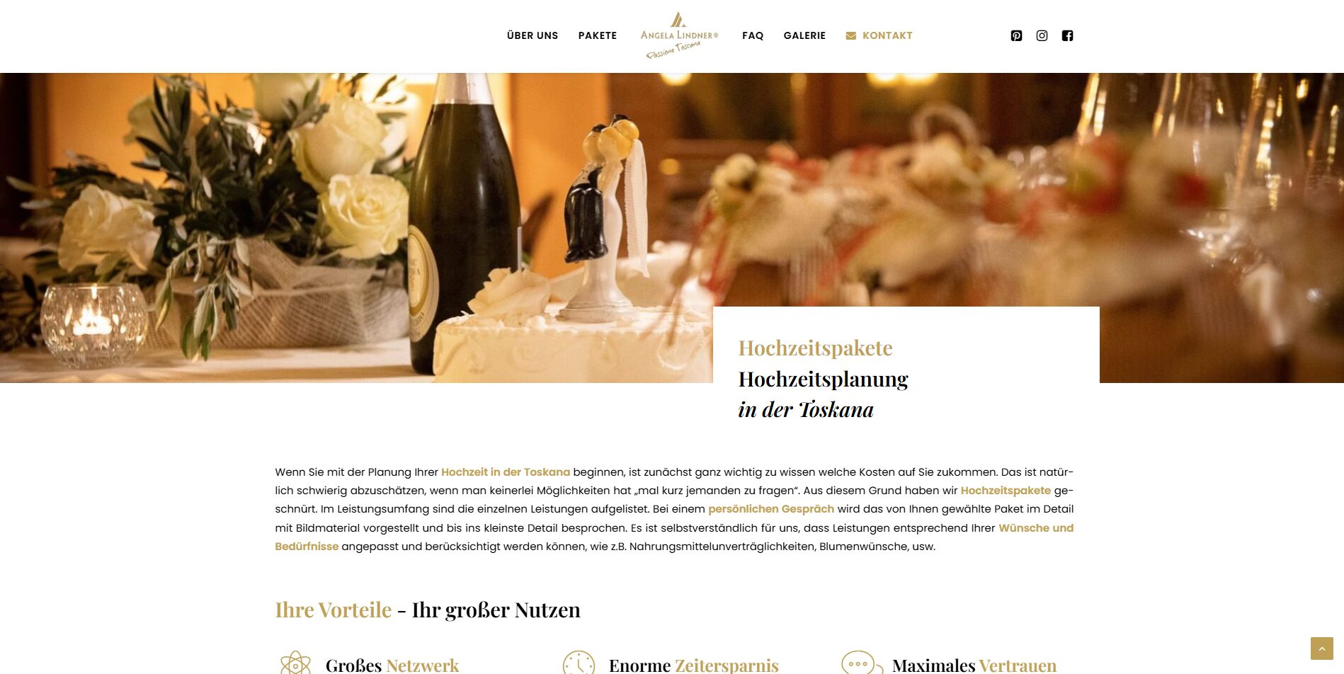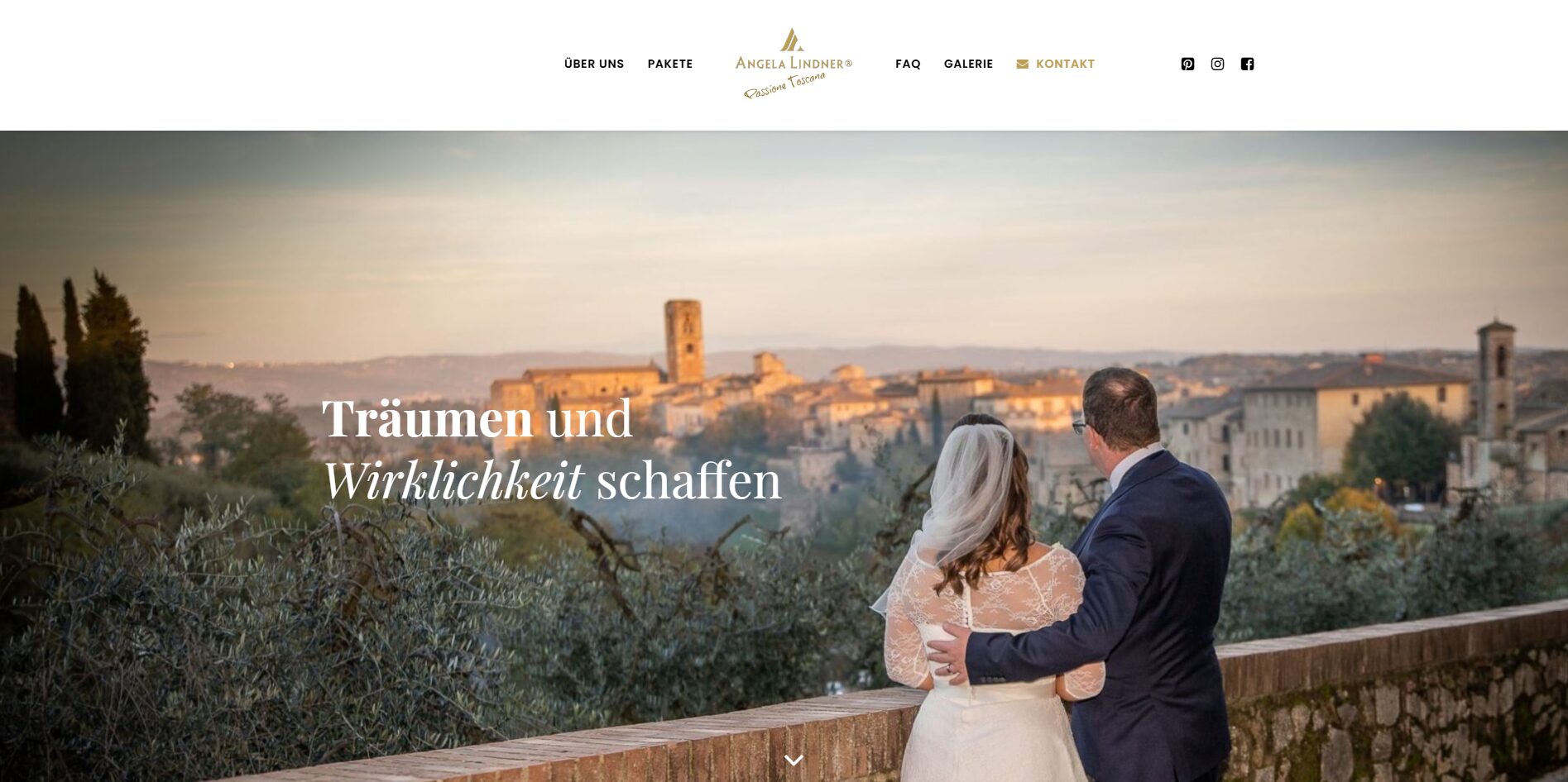 Für Angela Lindner, eine erfahrene Hochzeitsplanerin aus Wien mit Spezialisierung auf unvergessliche Hochzeiten in der Toskana, haben wir einen eleganten OnePager umgesetzt. Die Website präsentiert romantische Impressionen, vermittelt Emotionen und informiert Brautpaare umfassend über Leistungen, Locations und den Ablauf einer Hochzeit in Italien.