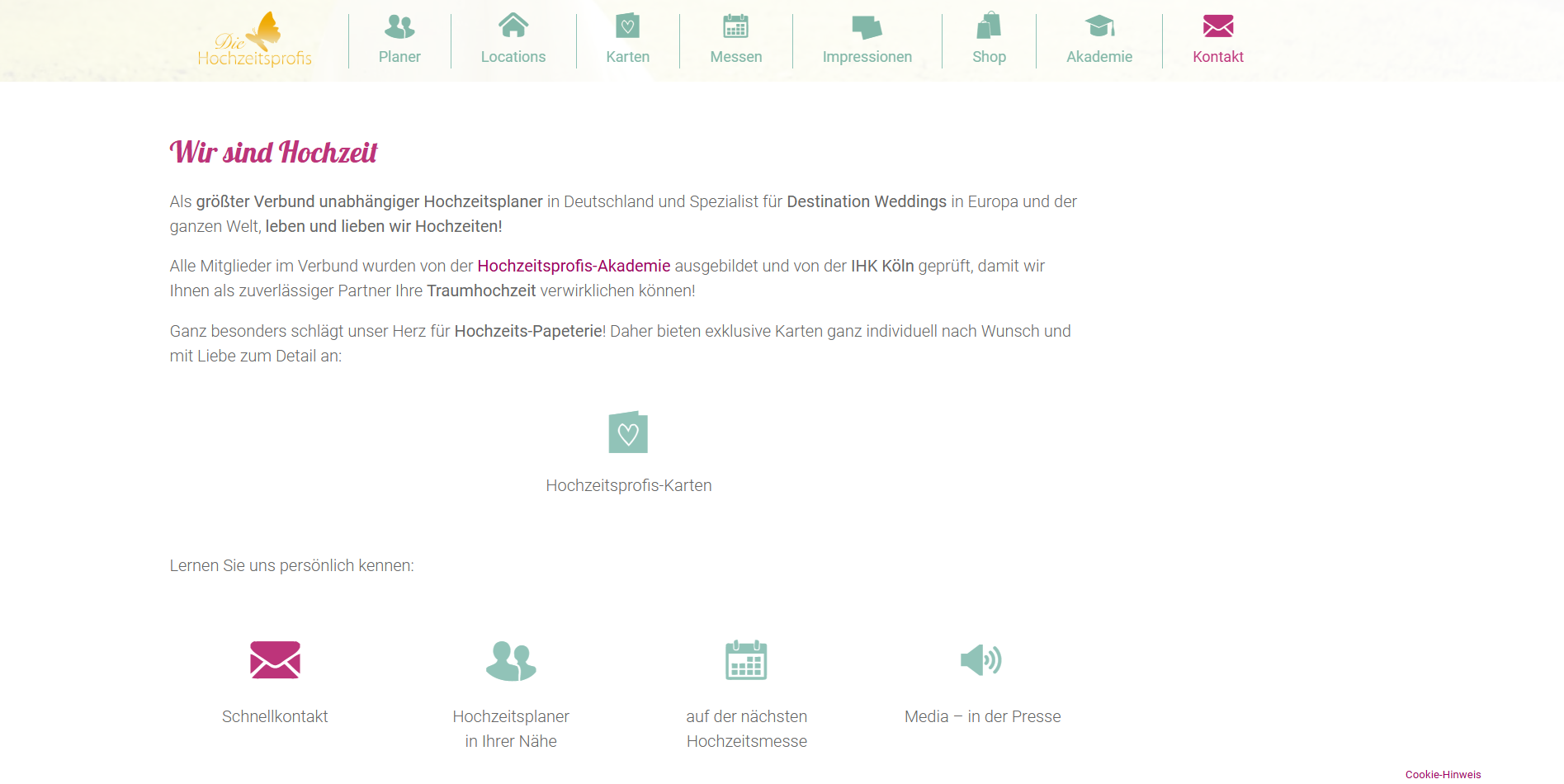 Für den Hochzeitsprofis-Verbund, einen Zusammenschluss von Hochzeitsplanern aus ganz Deutschland, haben wir eine moderne Website entwickelt, die alle Mitglieder professionell präsentiert.