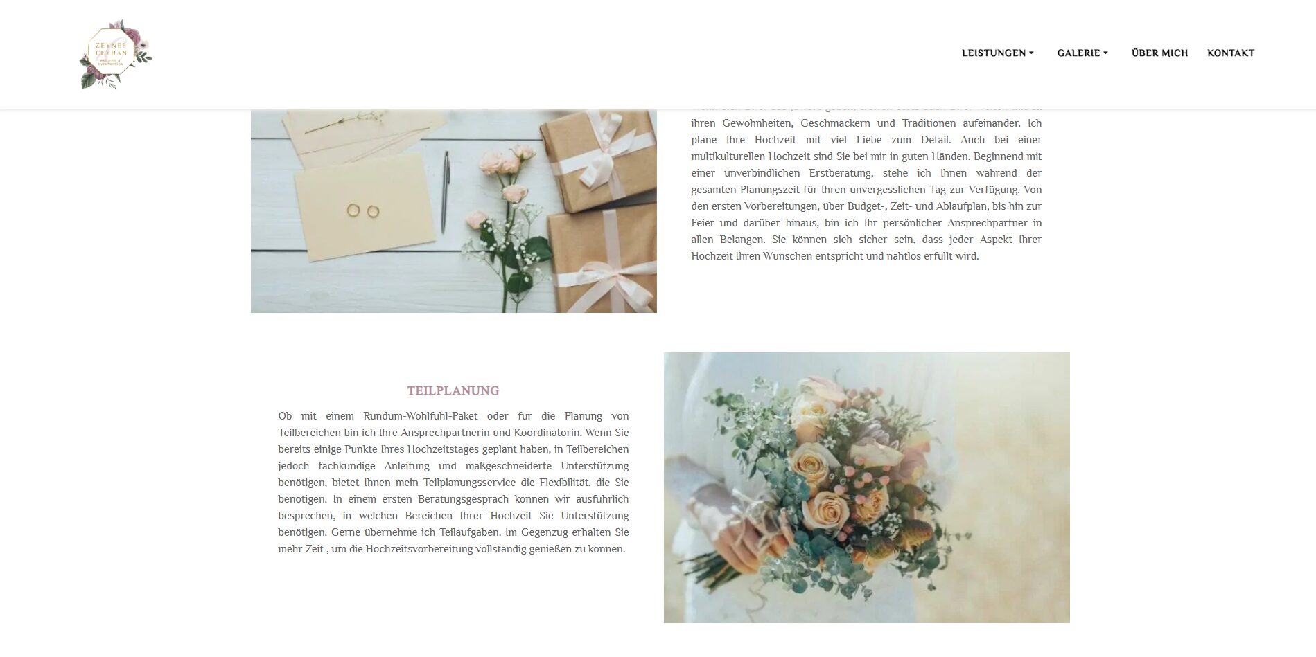 Die moderne WordPress-Website überzeugt mit einer ansprechenden Galerie, in der eindrucksvolle Hochzeitsmomente präsentiert werden. Ergänzt wird die Online-Präsenz durch individuell gestaltete Visitenkarten und Flyer, die Zeyneps Markenauftritt abrunden.